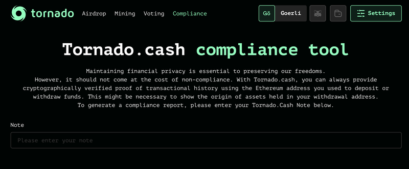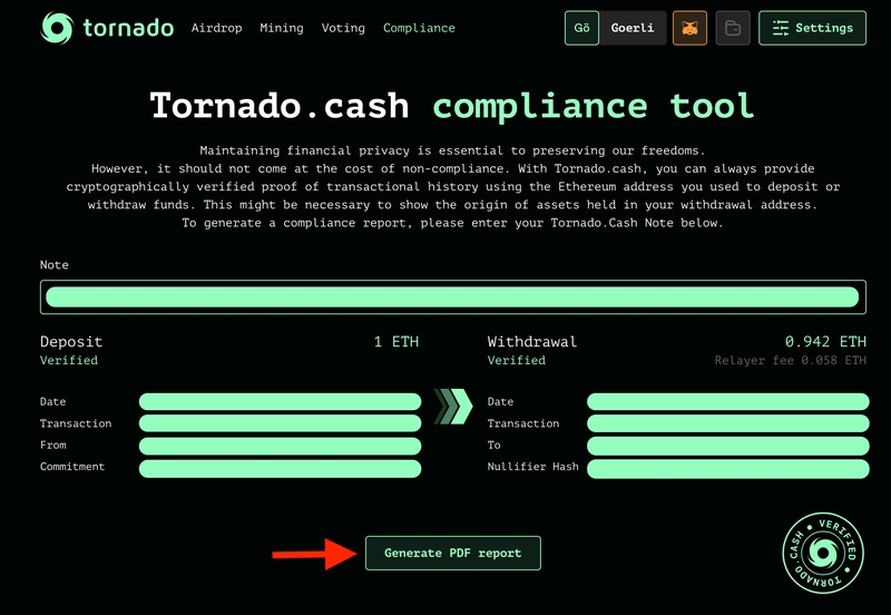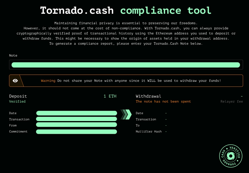 在此范围内,Tornado.Cash 合规工具使用户能够证明其资金来源。借助每次存款后生成的注释,此工具将使用用于存入和提取资产的以太坊地址发出经过加密验证的交易历史证明。