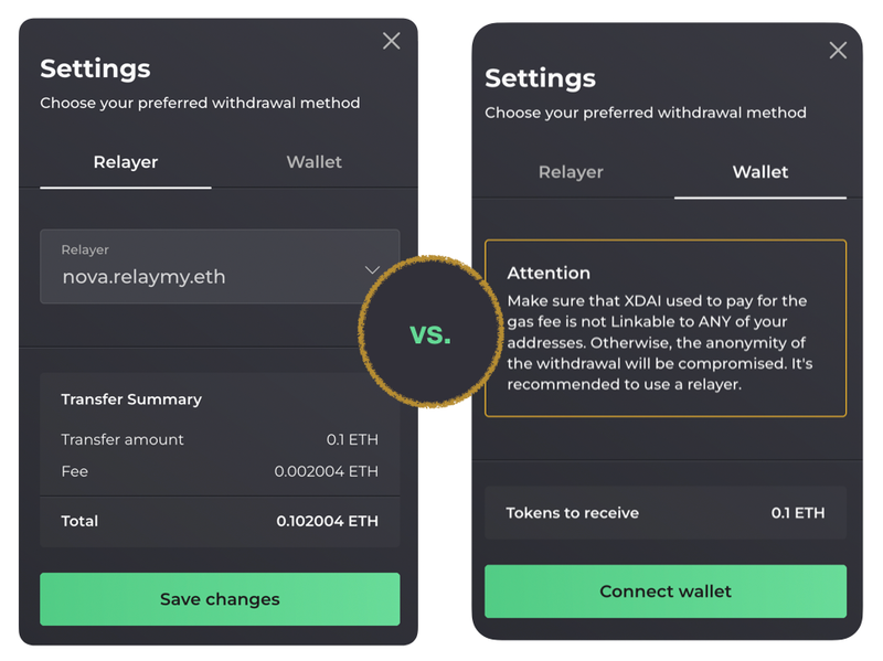 如果使用的 ETH 可以链接到您的身份,则通过您的钱包支付这笔 gas 费可能会损害交易的匿名性。因此,建议使用中继器来保护隐私