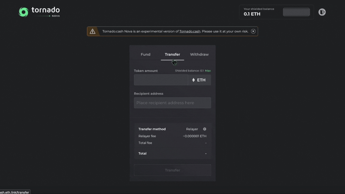 Tornado Cash Nova 的一个特点是引入了屏蔽转账。它允许在池内对存入的代币进行屏蔽交易。