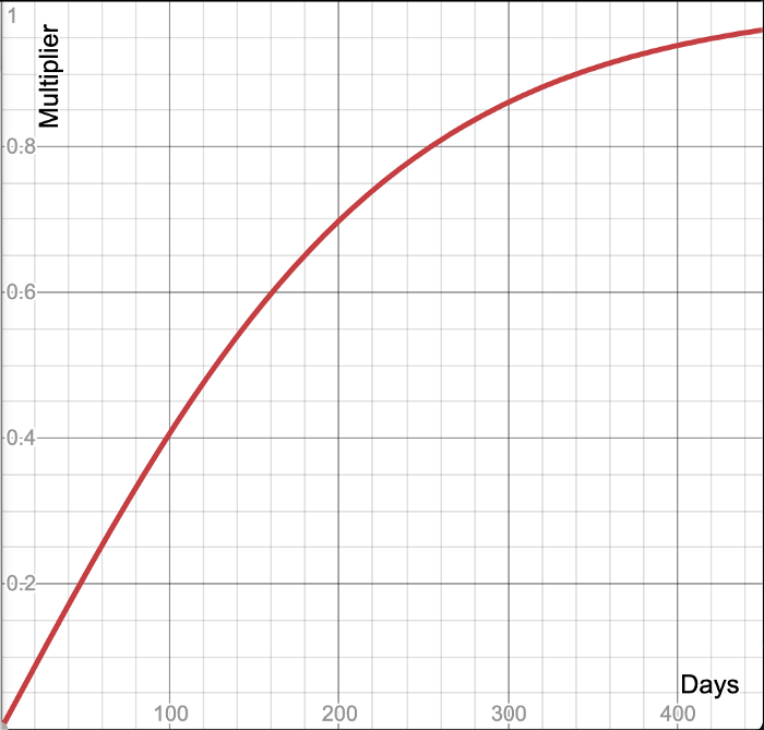 因此,100 ETH存款获得的令牌是1 ETH存款的两倍。该乘法器允许龙卷风现金的大大小用户在治理中都有发言权。时间乘法器的确切曲线如下所示: