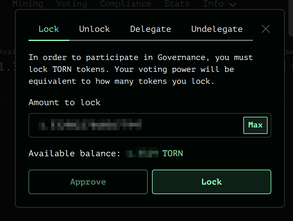 您首先需要将TORN令牌存入(或锁定)治理合同中: https://tornadoether.cash/governance 点击 Manage -> Lock Tab通过单击来批准将TORN令牌转移的治理合同 Approve 按钮。确认批准后,选择要存入的金额,然后单击 Lock。在钱包中确认交易并等待确认。