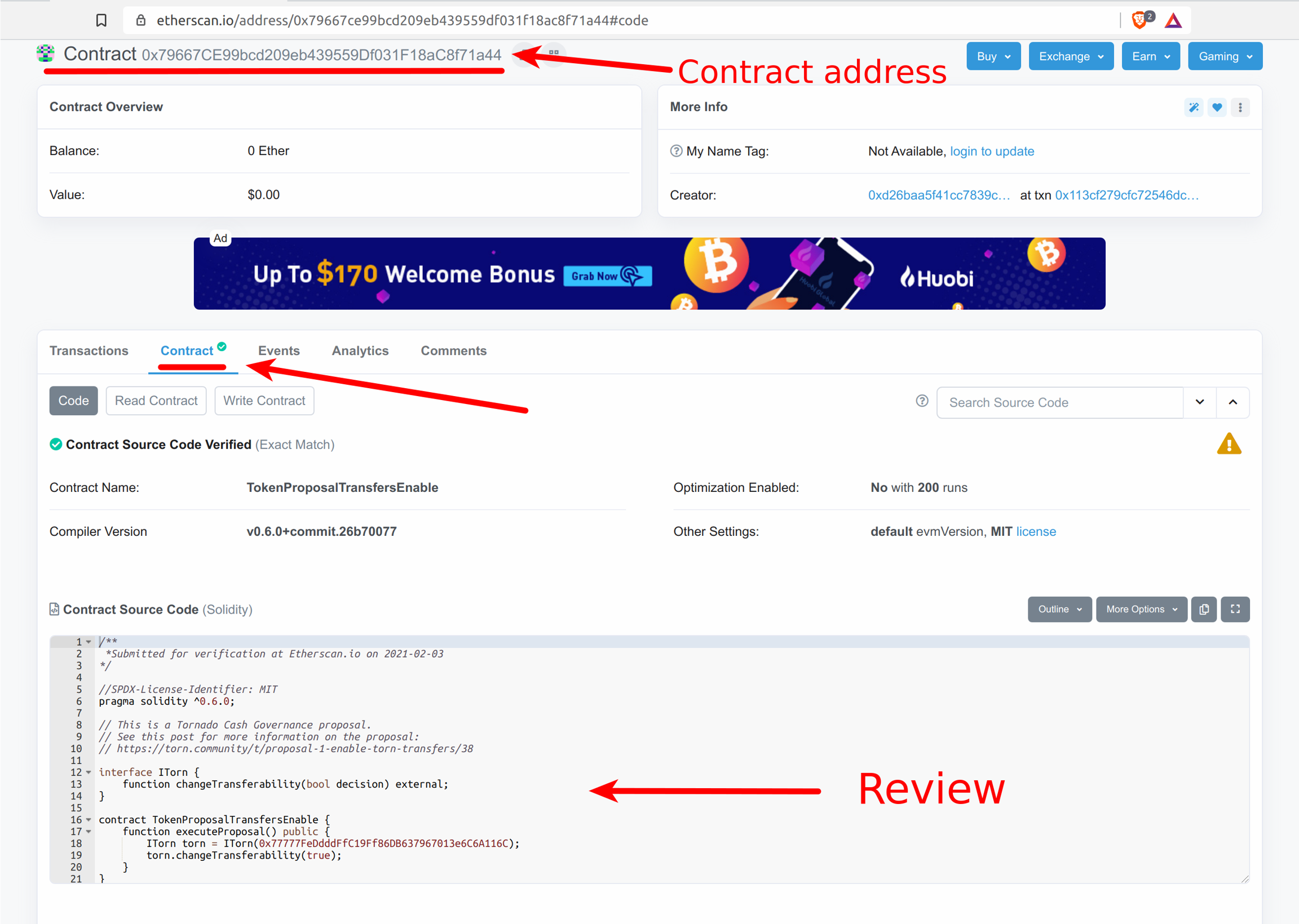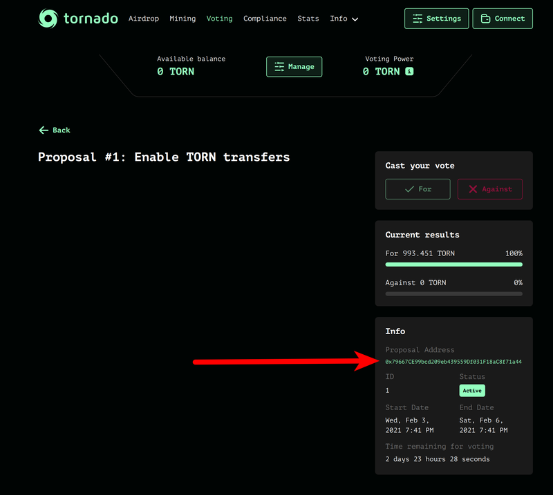 表决前,下一个关键步骤是审查提案。合法提案应专门发布 撕裂社区 在“提案”类别下?. 论坛帖子将提供有关该提案的其他背景和论据。阅读主题并对此问题下定决心。 提交提案后,应出现在: https://tornadoether.cash/governance 提案以智能合同的形式实施,对系统进行更改。因此,重要的是要验证智能合约的地址并查看其代码。 在此处找到提案合同的地址: